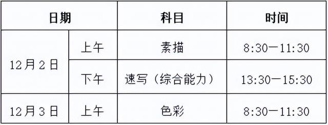 考生须按规定时间参加素描、色彩、速写(综合能力)三个科目考试,时间安排如下。开考15分钟后,考生不得进入考点参加当次科目考试。考试结束前30分钟方可交卷出场,出场后不得再进场续考,也不得在考场附近逗留或交谈。